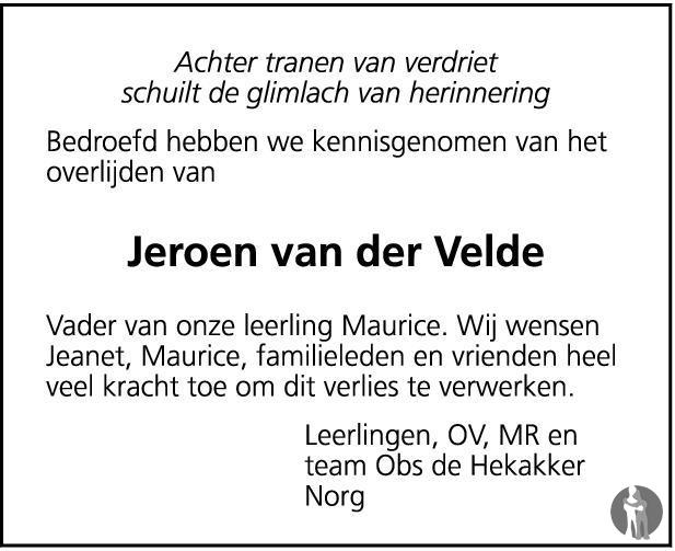 Jeroen Henk (Jeroen) van der Velde 02062011 overlijdensbericht en condoleances Mensenlinq.nl