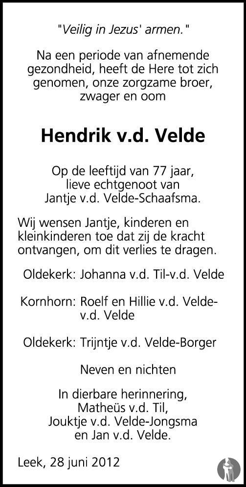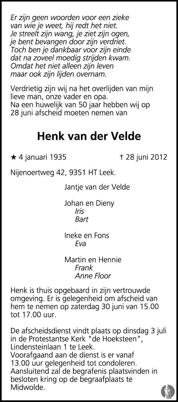 Henk van der Velde 28062012 overlijdensbericht en condoleances Mensenlinq.nl