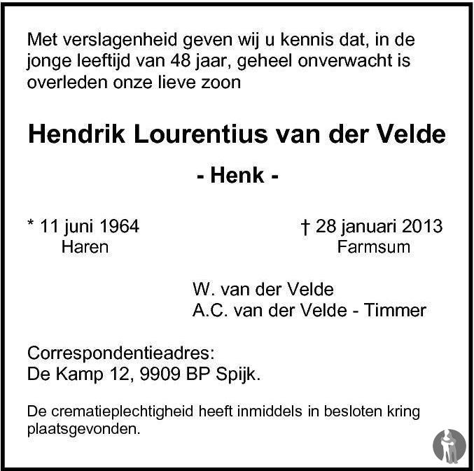 Hendrik Lourentius (Henk) van der Velde 28012013 overlijdensbericht en condoleances