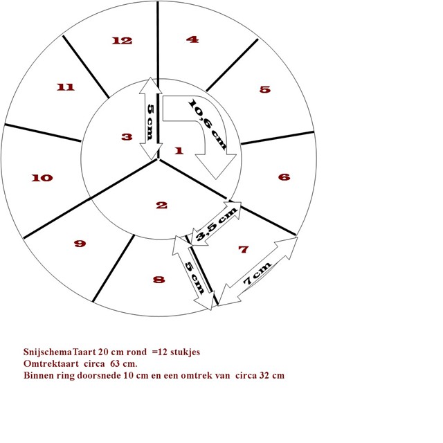 Snijschema's Taarten. Hieronder vind je de snijschema's voor diverse maten ronde taarten. De afbeeldingen die je hier ziet zijn verkleind. Je kunt ze downloaden door op de afbeelding te klikken. Deze afbeeldingen kun je uitprinten. De afbeelding zal dan wel verkleind worden tot het maximale formaat. (dit is meestal A4)