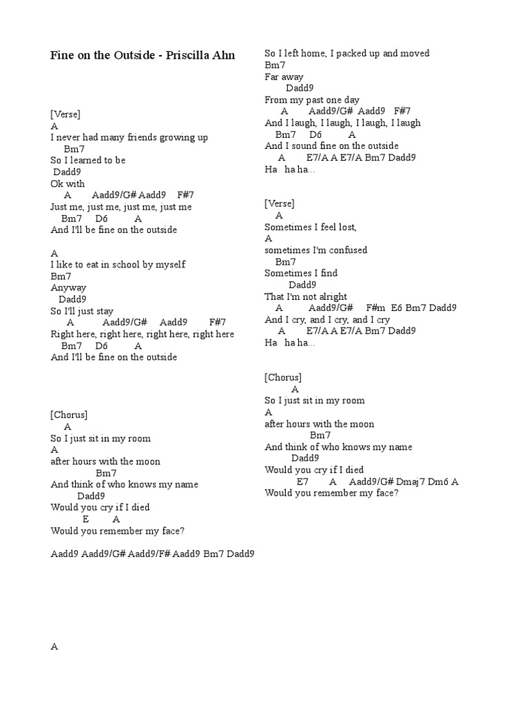 Create and get +5 IQ. Fine on the Outside by Priscilla Ahn Ending theme of When Marnie Was There [Verse] A I never had many friends growing up Bm7 So I learned to be Dadd9 Ok with A Aadd9/G# Aadd9 F#7 Just me, just me, just me, just me Bm7 D6 A And I'll be fine on the outside A I like to eat in school by myself Bm7 Anyway Dadd9 So I'll just.